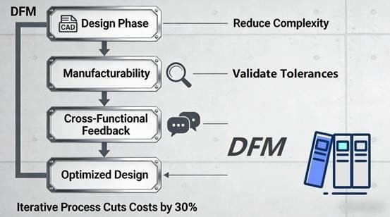 The impact of DFM can even be measured. Industry researches have discovered that integrating the principles of DFM will result in reducing production costs from 15% to 30%. This occurs due to effective utilization of material, reducing assembly time, keeping tooling simple, and avoiding defects. Designers can reduce surprises that come up during production if they analyze material characteristics, geometry of components, and tolerance analysis of parts during the very early design phases.
