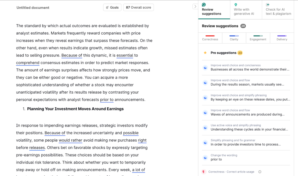 In response to impending earnings releases, strategic investors modify their positions. Because of the increased uncertainty and possible volatility, some people would rather avoid making new purchases right before releases. Others bet on favorable shocks by expressly targeting pre-earnings possibilities. These choices should be based on your individual risk tolerance. Think about whether you want to temporarily step away or hold off on making announcements. Every week, a lot of investors examine their portfolios, making note of impending earnings dates and determining which investments require attention. Regardless of market surprises, this proactive method keeps you in charge of your investing path by preventing reactive decision-making.